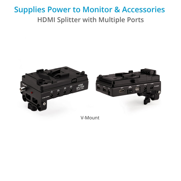HDMI Splitter with battery plate features multiple output ports. It supplies power to LCD monitor or other accessories.