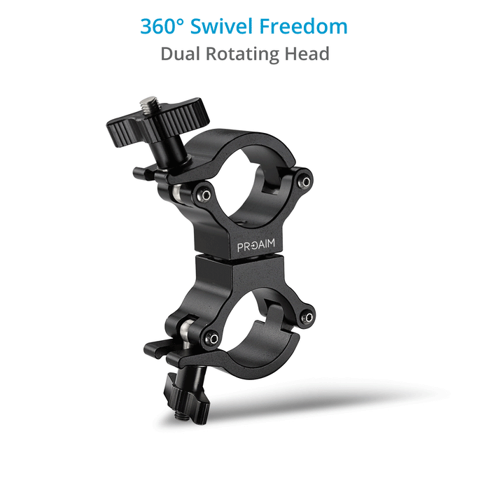Proaim Double Swivel Clamp offers a secure and quick connection for scaffolds, trusses, speed rails, bars, and rods. Crafted from high-grade aluminum, it offers exceptional strength and durability for your rigging needs.