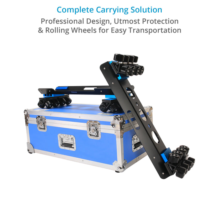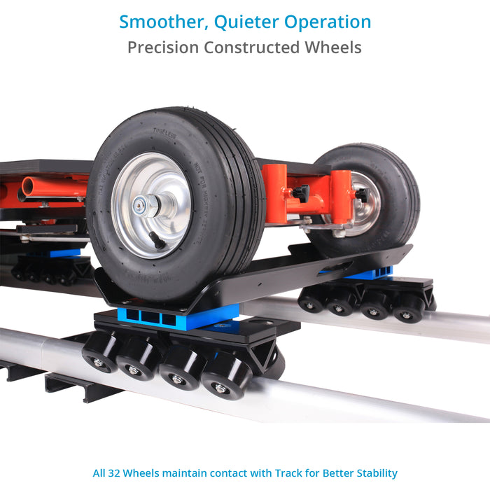 The Proaim Skateboard features a Split Carriage Design which ensures friction-free & smooth turning on Curved Tracks. Two Carriages have 4 wheels on each instead of the traditional 8 wheels per carriage design which helps all 32 wheels to maintain contact with the tracks even during turns.