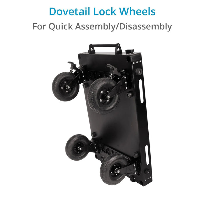 The Proaim Victor V1.1 comes equipped with 9" Pneumatic wheels and 100% sealed bearing housing which ensures that your cart endures any load placed upon it and still roll incredibly smooth and silent. The use of Pneumatic wheels instead of the industry-standard rubber wheels makes sure that the overall setup remains light, smooth and sturdy. The wheels attach to the cart via a Dovetail Mechanism that ensures quick assembly and disassembly.